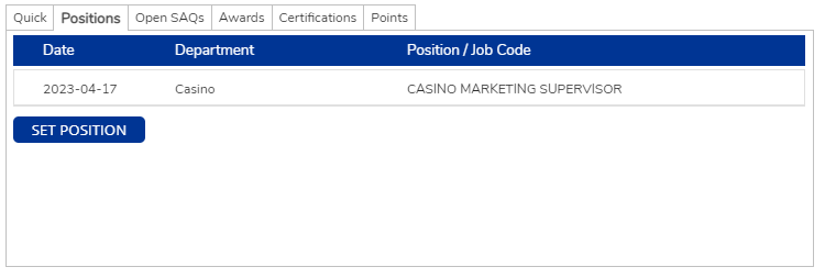 This displays the job code and department that the employee is currently associated with. If you need to update the position, click the SET POSITION button.