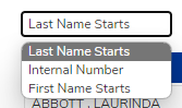 The default search is by Last Name Starts. That means if you enter the letter T, then all employees whose last name begins with the letter T will be returned by the search. You may also search by First Name Starts or by your company's Internal Number that is assigned by your HRIS system.
